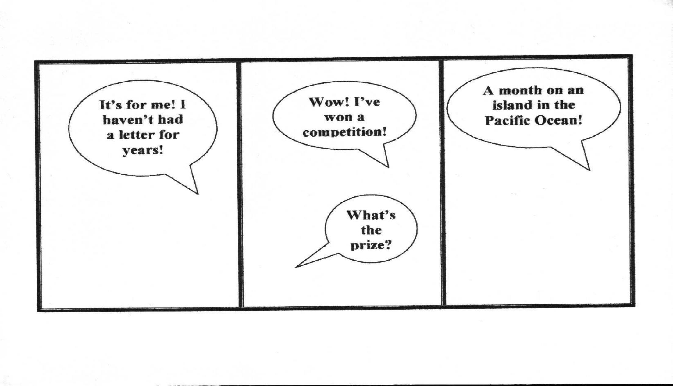 THE SHERLOCK HOLMES STRATEGY MESSAGE IN THE BOTTLE - STEP 2 So you think you're basically a visual verbal learner? OK! Look at the comic strip on this page and guess what might be happening. Consider the table below. In Column A (Possible hypotheses) make a note of what's happening in each picture. In Column B (Supporting evidence) list all the factors that helped you to formulate your hypothesis. Then prepare your version: · simply tell the story, or · draw the pictures, or · act out the story, or · choose another way of presentation! When you're ready to see the original version of the strip, click